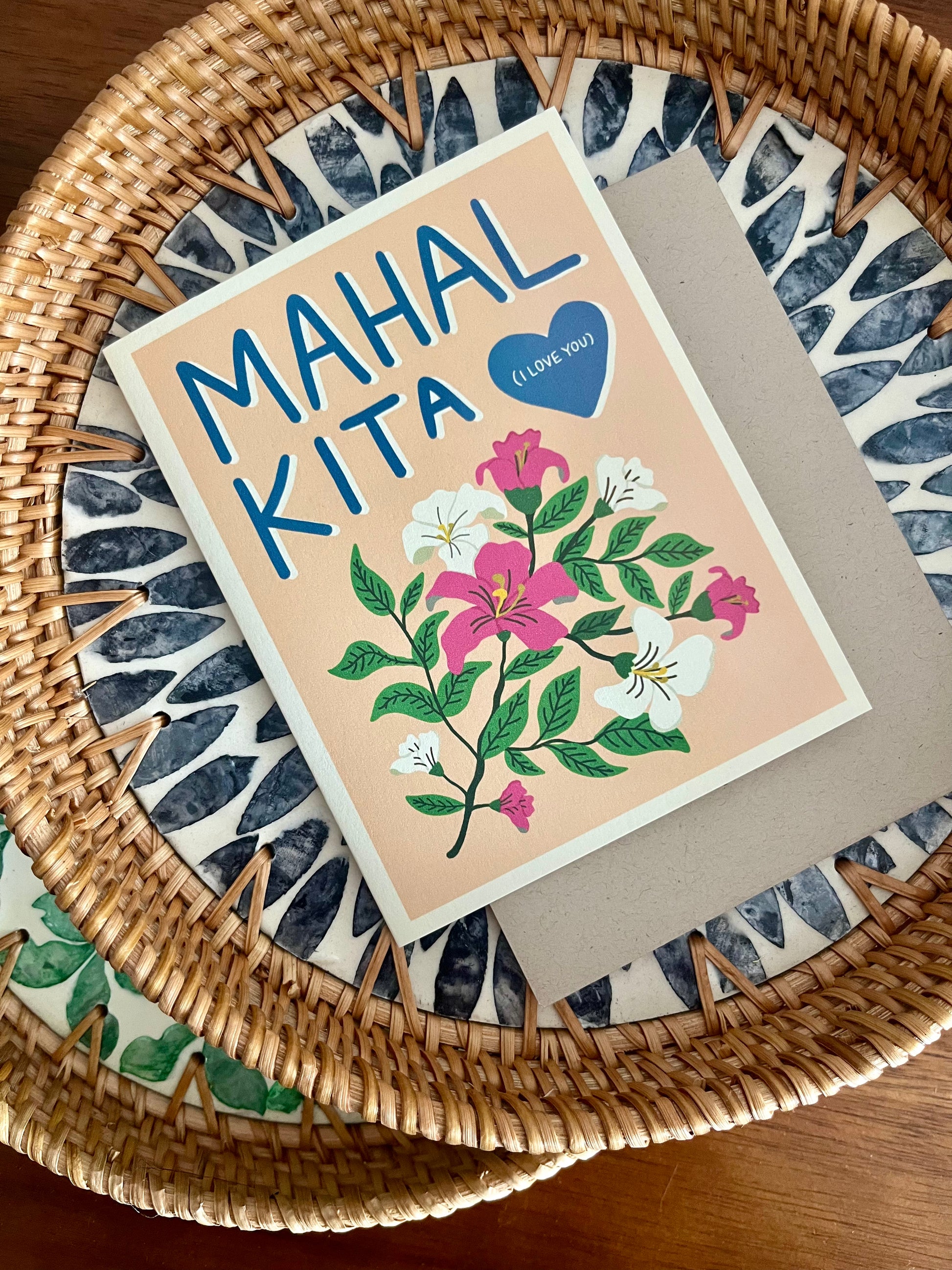 From the brand, A Duck Amuck, this greeting card features "I Love You" in Tagalog, "Mahal Kita". The artist behind the brand illustrates hand lettering and a digital drawing of pink and white flowers.